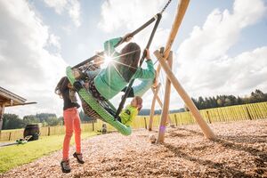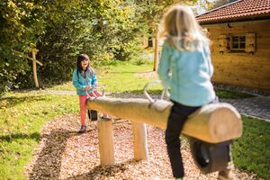 Eine Nest-Brett-Schaukel darf natürlich auch nicht fehlen und der Kletter-Fendt-Traktor mit Rutsche garantiert zudem keine Langeweile. Höhenluft kann bei der Wippe geschnuppert oder zum Balancieren ausgetestet werden. Über ein paar Meter verleiht einem die Seilbahn ein Gefühl des Fliegens und der Freiheit. Das versenkte Riesentrampolin ist bei den Akrobaten immer noch besonders beliebt.