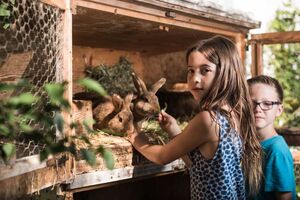 Ob mit dem Hofhund Susi schmusen, mit den Katzen spielen, unsere Meerschweinchen Peter und Paul füttern, die Hühner beim Picken beobachten oder die Enten Lilly, Erna und Tom bei Zeiten „zu Bett“ bringen. Im Hasenstall freuen sich unsere kuscheligen Langohren jederzeit auf frisch gepflückten Löwenzahn.