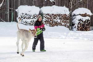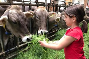 Selbstverständlich liebt auch „unsere Jugend“ im Stall – die Kälbchen - Zärtlichkeiten von Euch zu bekommen. Unsere Kuh Marita mit Ihren Kolleginnen dürft Ihr natürlich auch ganz nahe kommen und sie füttern.