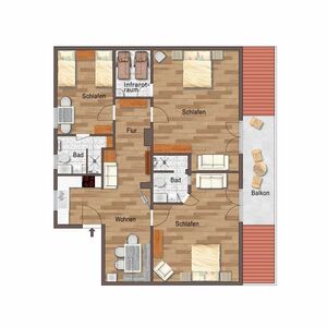 Die 3 großzügigen Schlafzimmer mit Altholz-Betten und die nostalgischen Bauernschränke erzählen ihre ganz eigene Geschichte. Zwei edle Komfort-Bäder mit Regenduschen und die wohltuende Tiefenwärme einer Luxus-Infrarotkabine mit Entspannungsliegen lässt zudem keine Wünsche offen.