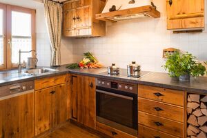 • komplett ausgestattete Altholz-Küche mit Geschirrspüler, Kühlschrank m. Gefrierfach, Kaffeemaschine, Handrührgerät, Wasserkocher, Toaster, Eierkocher und Zauberstab.